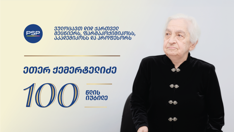 ფარმაცევტული კომპანია PSP 100 წლის იუბილეს ულოცავს დიდ ქართველ მეცნიერს, ფარმაკოქიმიკოსს, აკადემიკოსსა და პროფესორს, ქალბატონ ეთერ ქემერტელიძეს