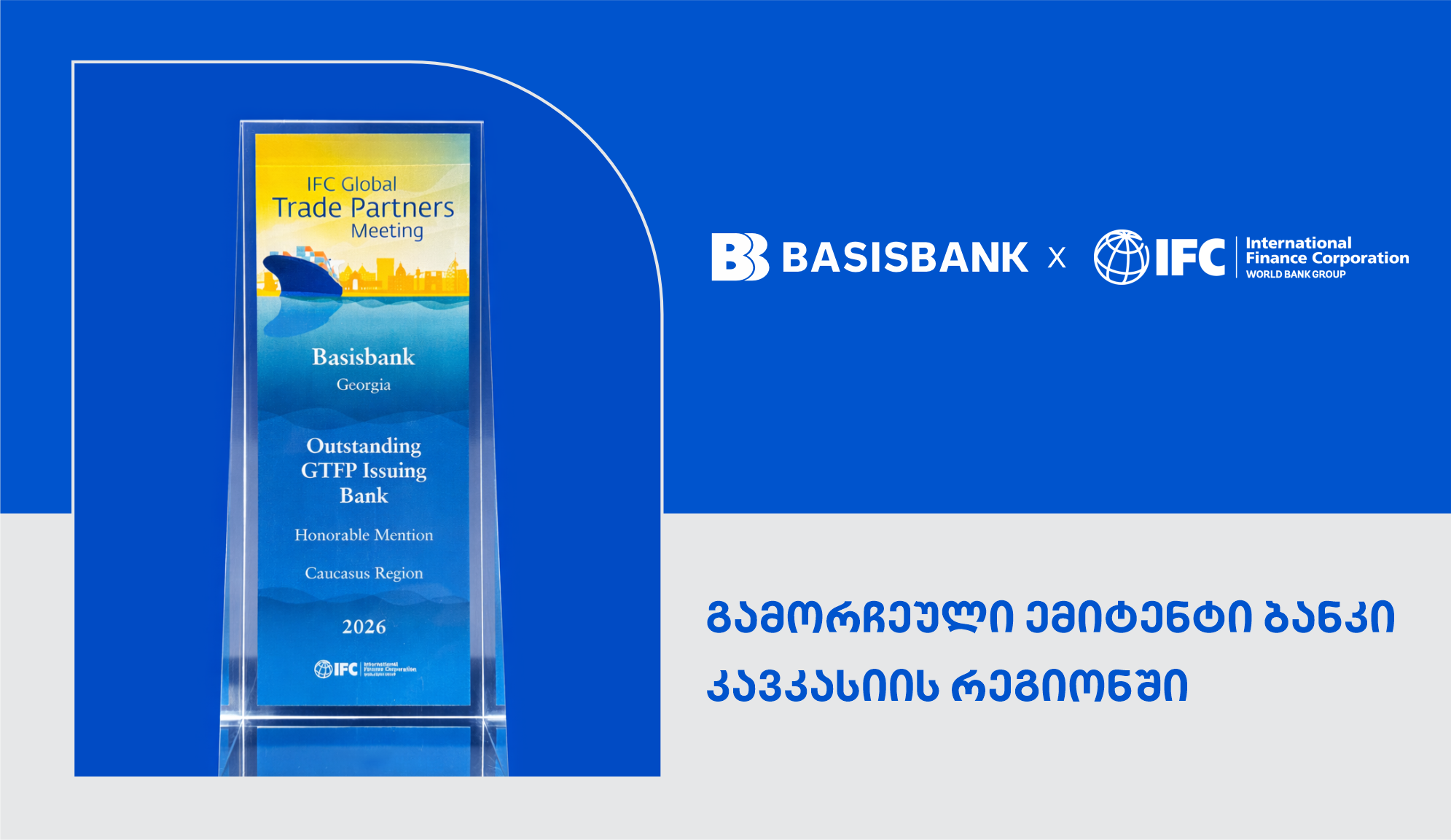 ბაზისბანკმა, IFC-ის მე-9 „გლობალური სავაჭრო პარტნიორების შეხვედრაზე“, საპატიო ჯილდო მიიღო, როგორც კავკასიის რეგიონში GTFP-ის გამორჩეული ემიტენტი ბანკი.