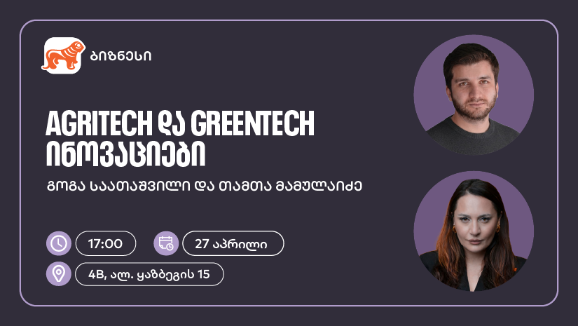 27 აპრილს, 17:00 საათზე, ბიზნეს 360˚-ის შეხვედრების სერიის ფარგლებში, საქართველოს ბანკის ორგანიზებით, ბიზნესის წარმომადგენლებისა და დაინტერესებულ პირებისთვის ვორქშოპი - „AgriTech და GreenTech ინოვაციები“ გაიმართება. შეხვედრას თამთა მამულაიძე და გოგა საათაშვილი გაუძღვებიან.