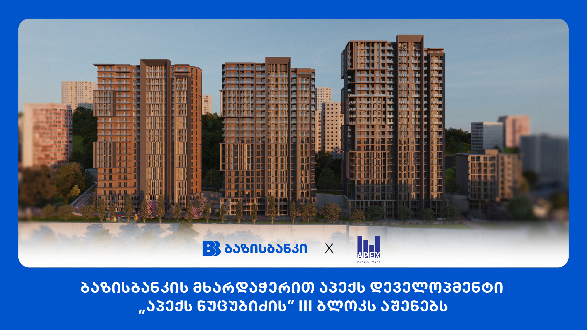 ბაზისბანკი, როგორც ბიზნესის ერთ-ერთი უმსხვილესი მხარდამჭერი, განაგრძობს სამშენებლო და დეველოპერულ კომპანიებთან თანამშრომლობას. ამჯერად, ბაზისბანკის ფინანსური პარტნიორობით დეველოპერული კომპანია აპექს დეველოპმენტი „აპექს ნუცუბიძის“ III ბლოკს აშენებს.