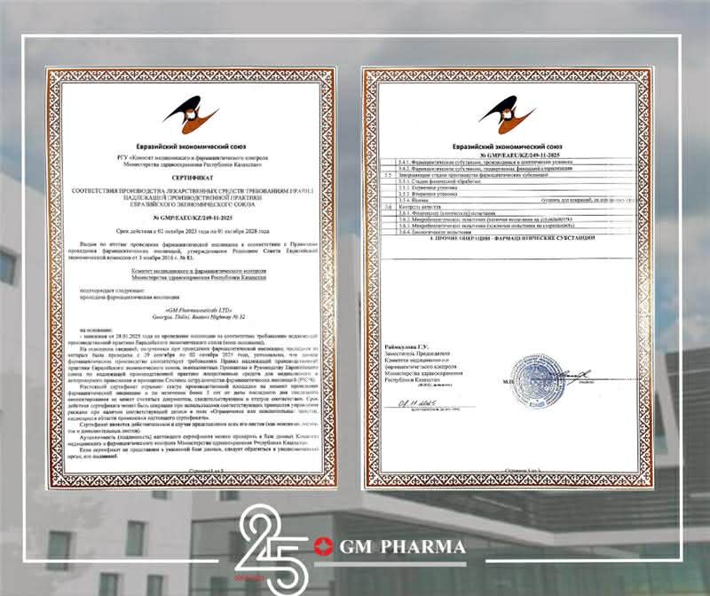 საერთაშორისო ფარმაცევტული კომპანია GM PHARMA დაარსების დღიდან 25 წლის მანძილზე, მუდმივად ინარჩუნებს ლიდერ პოზიციას რეგიონში. კომპანიამ განსაკუთრებული შედეგებით შეაჯამა წელი – წარმატებით გაიარა ევრაზიული ეკონომიკური კავშირის (EAEU) კარგი საწარმოო პრაქტიკის (GMP) ინსპექტირება და კიდევ ერთხელ დაამტკიცა, რომ მთავარი პრიორიტეტი მაღალი ხარისხი და საერთაშორისო სტანდარტების შესაბამისობაა.